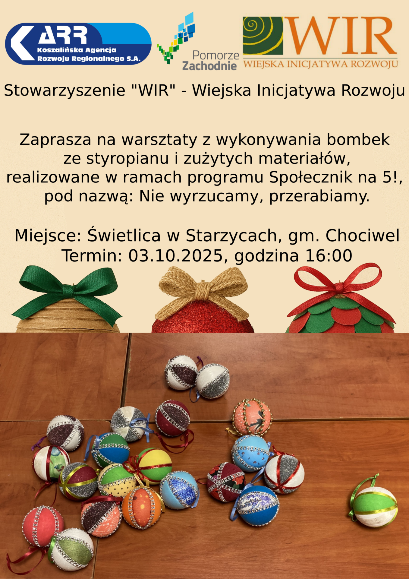 READ MOREAdres: Starzyce 14 Strona: https://www.facebook.com/photo?fbid=1187161050114811&set=a.458188599678730 Facebook: E-mail: wir-lgd@wp.pl Telefon: 915784378 Stowarzyszenie “WIR” – Wiejska inicjatywa Rozwoju zaprasza na warsztaty z wykonywania bombek jako ozdób bożonarodzeniowych ze styropianu i