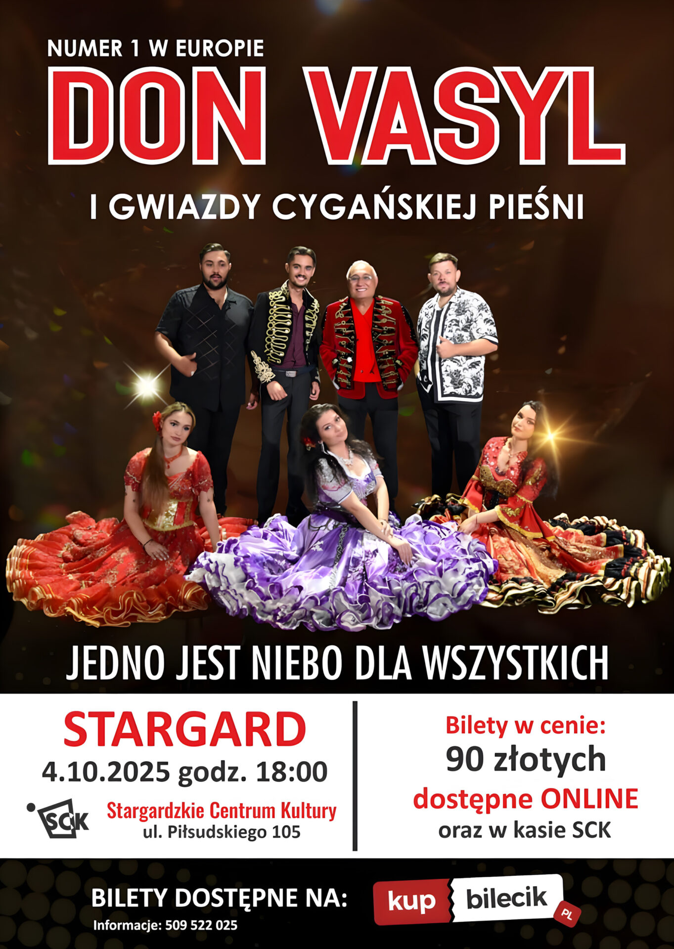 READ MOREAdres: Piłsudskiego 105 Strona: https://sck.stargard.pl/kalendarz-wydarzen/koncert-don-vasyl-i-gwiazdy-cyganskiej-piesni/ Facebook: E-mail: sekretariat@sck.stargard.pl Telefon: 915783231 Zespół Artystyczny Don Vasyl i Roma powstał w 1987 roku. „Roma”, ponieważ trzon zespołu stanowią członkowie legendarnej grupy