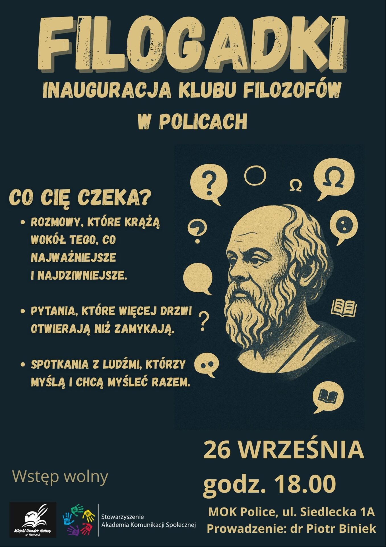 READ MOREAdres: Siedlecka 1 A Strona: https://www.mokpolice.pl/zapowiedzi/850-filogadki-czyli-spotkania-klubu-filozofow-w-policach.html Facebook: E-mail: mok@mokpolice.pl Telefon: 913121055 Filogadki, czyli spotkania Klubu Filozofów w Policach Czy zdarza Ci się zadawać pytania, na które nie