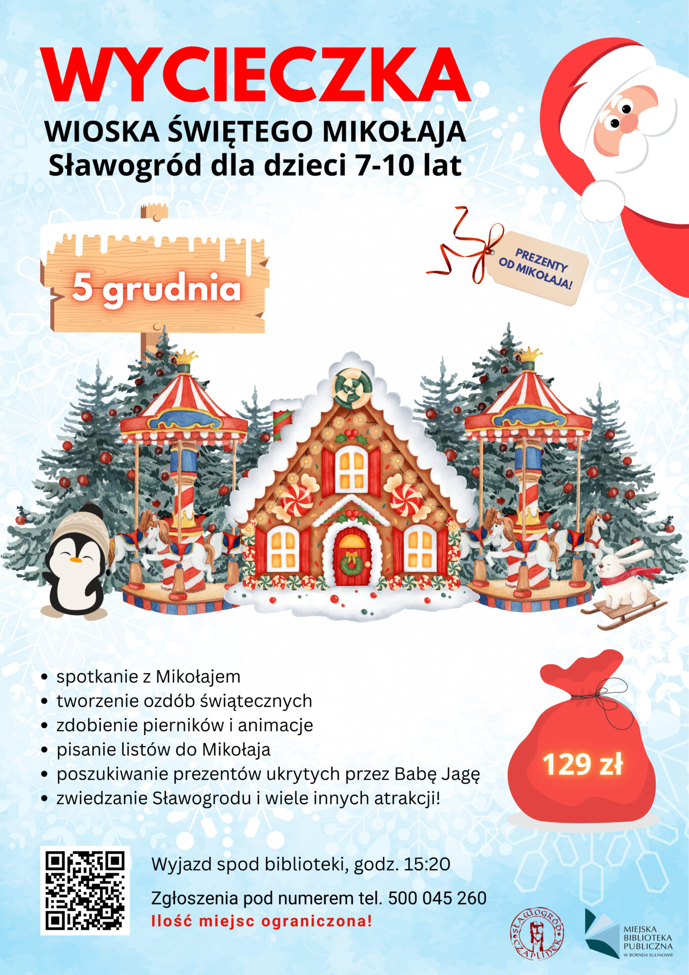 Adres: Szpitalna 1 Strona: https://www.facebook.com/mbpbornesulinowo/posts/pfbid02MSpWaf7ymhvDkSFjHMHtQHJShrsxCMTJREnkG5g2sh5YsXyukPdyz3fxViKV2U6Pl Facebook: E-mail: mbp@mbp.bornesulinowo.pl Telefon: 500045260 Zapraszamy dzieci w wieku 7-10 lat na wycieczkę do Wioski Świętego Mikołaja w Sławogrodzie (Czaplinek), która odbędzie się