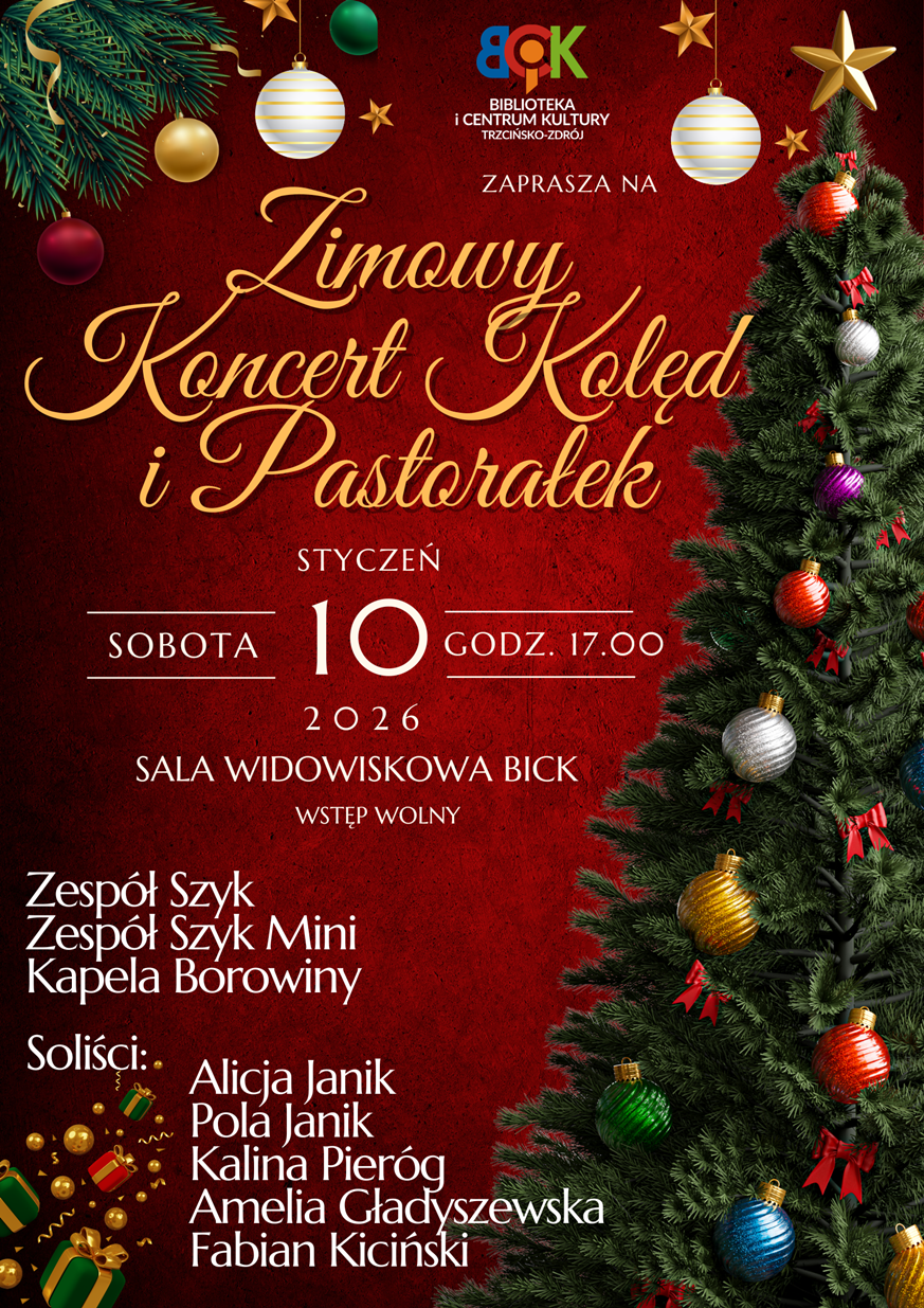 READ MOREAdres: Młyńska, 4 Strona: http://bicktz.pl Facebook: E-mail: tck@interia.eu Telefon: 914148043 Biblioteka i Centrum Kultury w Trzcińsku-Zdroju serdecznie zaprasza wszystkich mieszkańców oraz gości na wyjątkowy „Zimowy Koncert Kolęd i