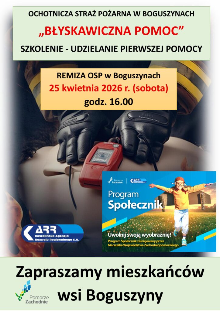 25 kwietnia 2026 r. w remizie OSP w Boguszynach odbędzie się nowoczesne szkolenie z zakresu pierwszej pomocy, skierowane do mieszkańców wsi Boguszyny. Szkolenie zostanie przeprowadzone przez druhów z OSP Boguszyny i będzie doskonałą okazją do zdobycia praktycznych umiejętności ratowniczych oraz nauki skutecznego reagowania w sytuacjach zagrożenia życia.
