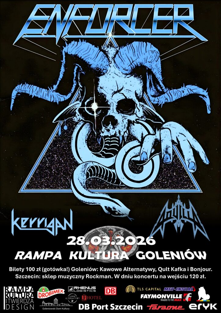 Szwedzki Enforcer to bez wątpienia najważniejszy i najbardziej wpływowy zespół heavymetalowy lat dwutysięcznych. Powstały w 2005 roku zespół przeciwstawił się ówczesnym trendom, stając się siłą napędową w świecie zdominowanym przez chugcore i rozwodniony metal. Ich wczesne albumy, wydane w latach 2008-2010, zapoczątkowały światowy ruch znany jako Nowa Fala Tradycyjnego Metalu, szybko zdobywając popularność na scenie undergroundowej. Do 2012 roku Enforcer podpisał globalny kontrakt z gigantem metalu Nuclear Blast, wydając trzy kolejne albumy i umacniając swoją pozycję jako jednego z najbardziej znanych zespołów heavymetalowych swojego pokolenia. Ich agresywne, bezkompromisowe brzmienie zaowocowało niezliczonymi trasami koncertowymi po całym świecie, inspirując kolejne pokolenia fanów metalu. W 2023 roku Enforcer powrócił z albumem Nostalgia, który odzwierciedla upływ czasu i nieuchronny rozpad wszystkiego. Stanowi on powrót do speedmetalowych korzeni po bardziej eksperymentalnym Zenith. Album, pełen hitów, łączy ekstremalne metalowe riffy z chwytliwymi, stadionowymi refrenami, pozostając wiernym charakterystycznemu stylowi Enforcer i umacniając ich pozycję jednego z czołowych zespołów heavymetalowych. Gość Specjalny: Aquillla (Polska) Support: Kerrigan (Niemcy) Bilety w sprzedaży od 12.12.2025. Koncert organizuje Rock Hard Ride Free we współpracy ze Stowarzyszeniem Motocyklistów Goleniowskich i Goleniowskim Domem Kultury.