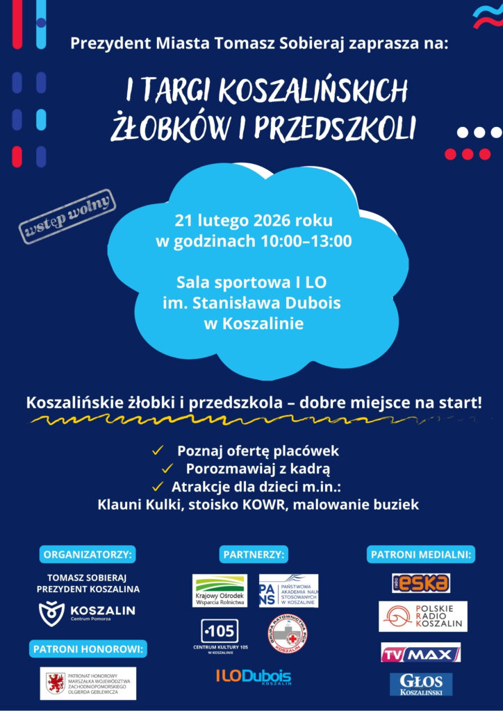 Zapraszamy rodziców i opiekunów wraz z dziećmi na I Targi Koszalińskich Żłobków i Przedszkoli – wydarzenie, podczas którego w jednym miejscu będzie można poznać ofertę koszalińskich publicznych żłobków i przedszkoli.