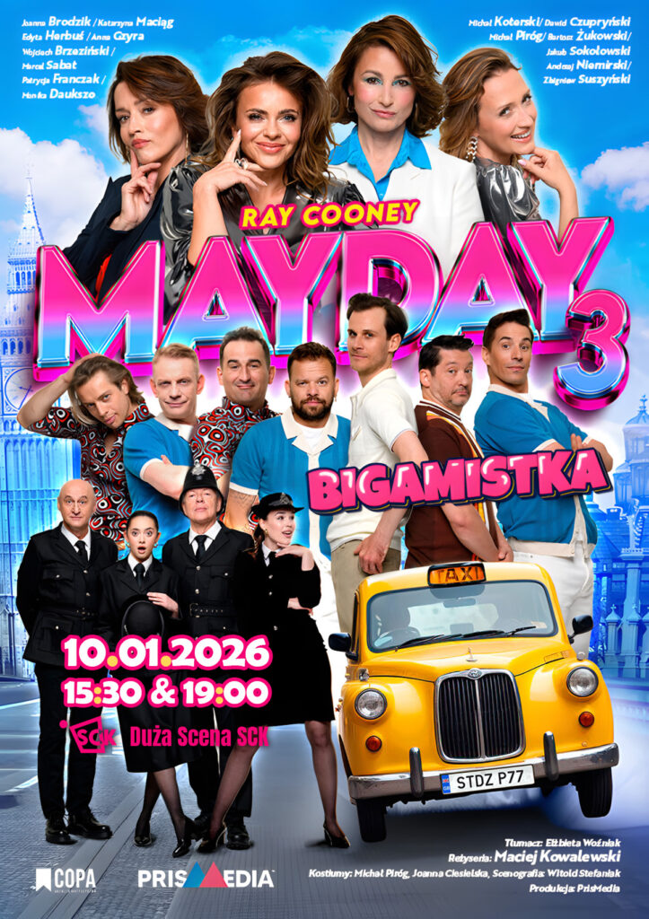 Niesamowicie zabawne sytuacje zaprowadzą nas do rozwiązania tej zagadki. Mayday Bigamistka to znakomita, dynamiczna komedia Raya Cooneya w kongenialnej adaptacji Michaela Barfoota, w tłumaczeniu Elżbiety Woźniak i w reżyserii Macieja Kowalewskiego, znanego widzom z reżyserii kultowych spektakli: The Strings czy Kolejny wieczór kawalerski.