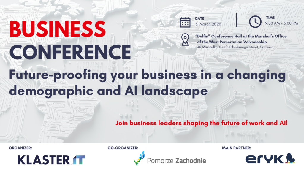 W obliczu zmian demograficznych i dynamicznego rozwoju AI wiele firm zadaje sobie pytanie: jak się skalować, przyciągać talenty i pozostać konkurencyjnym na globalnym rynku? W odpowiedzi na te wyzwania zapraszamy na międzynarodową konferencję biznesową „Future-proofing Your Business in a Changing Demographic and AI Landscape”, która odbędzie się 31 marca 2026 r.. Wydarzenie organizowane jest przez Klaster IT, firmę Eryk IT oraz Centrum Inicjatyw Gospodarczych Urzędu Marszałkowskiego w Szczecinie Pomorze Zachodnie.