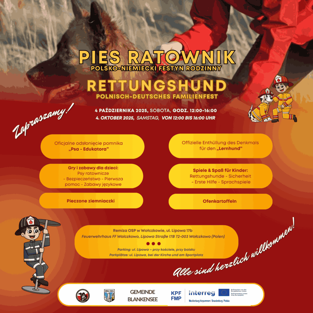 Gmina Dobra wraz z Grupą Poszukiwawczo-Ratowniczą Zachodniopomorskie Psy Ratownicze oraz Gminą Blankensee serdecznie zapraszają mieszkańców oraz gości na polsko-niemiecki festyn rodzinny PIES RATOWNIK, który odbędzie się 4 października 2025 r. (sobota) w godzinach 12:00–16:00 przy remizie Ochotniczej Straży Pożarnej w Wołczkowie (ul. Lipowa 17B).
