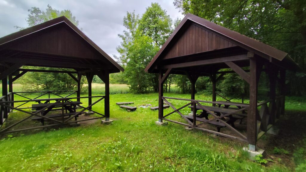 Dwie wiaty piknikowe, miejsce na ognisko oraz zejście do rzeki.