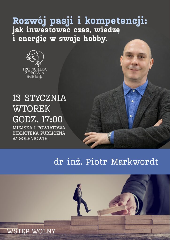 Miejska i Powiatowa Biblioteka Publiczna w Goleniowie wspólnie z Tropicielką Zdrowia Anettą Wnuk zapraszają na spotkanie pt. “Rozwój pasji i kompetencji: jak inwestować czas, wiedzę i energię w swoje hobby”, które odbędzie się 13 stycznia o godz. 17:00 w bibliotece. Spotkanie poprowadzi dr inż. Piotr Markwordt.